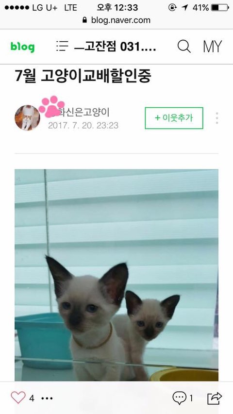 저희 샴 고양이가 8마리를 출산하여 아가들이 크니 오피스텔에서 다 키우기가 여건이 안되서 네이버 고양이 카페 X이네에 분양글을 올렸습니다.