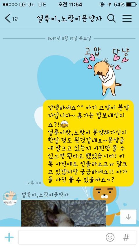 혹시 설마 아니겠지라는 생각에 샵 전화번호를 눌러보는데 얼룩이, 노랑이 분양자가 내 핸드폰에 뜨네..아진짜 세상 무너지는줄.. 분양간지 한달 가량된 것 같은데 분양조건에 가끔 사진 좀 보내 달라했다 한 달이 지나도 올 생각을 안하길래 8/17일 내가 먼저 잘지내냐고 연락을 줬더니 잘지낸다고 아가들 집에서 같이 찍은것 같은 사진을 보내줬다.