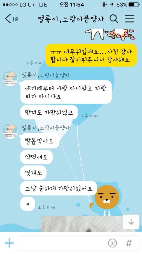 카톡말고 전화하라고 하고, 전화하니 받자마자 헛웃음이나 짓고 키우는 환경이 비위생적이라면서 거기 지내는거보다 훨씬 넓고 깨끗란 좋은 환경으로 분양갔다니(노랑이). 그리고 다른 사람 같았으면 자기 돈주고 분양받았는데 욕하고 끝내면 된다고 하시더라구요..ㅎ