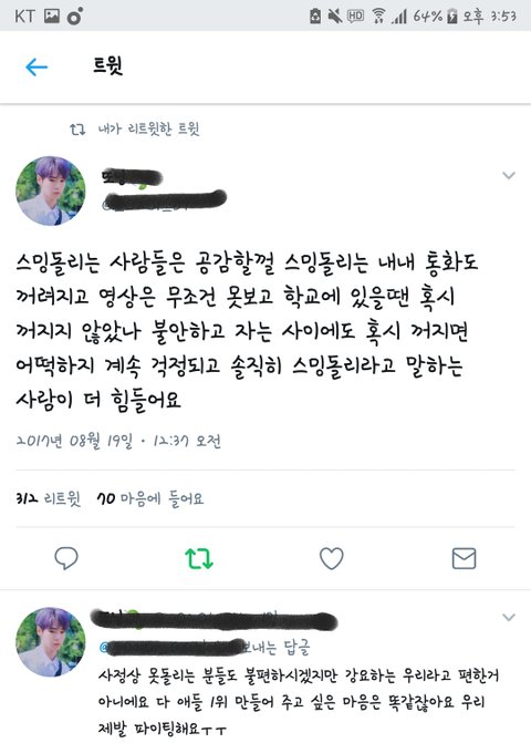이거 진짜 공감한더 ㅠㅠㅠㅠㅠㅠ애들이랑 우리좀 생각해주면.안되겠니? ㅠㅠㅠㅠㅠㅠㅠㅠ 림들면 총공계가 도와준다는데도 그거마저 안하면 진짜 스밍하는 사람 입장에서는 너무 힘빠져....