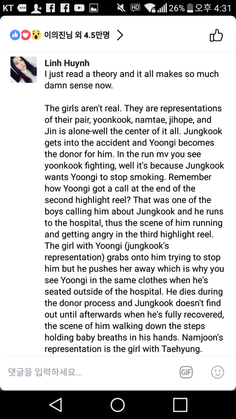 The girls aren't real. They are representations of their pair, yoonkook, namtae, jihope, and Jin is alone-well the center of it all. Jungkook gets into the accident and Yoongi becomes the donor for him. In the run mv you see yoonkook fighting, well it's because Jungkook wants Yoongi to stop smoking. Remember how Yoongi got a call at the end of the second highlight reel? That was one of the boys calling him about Jungkook and he runs to the hospital, thus the scene of him running and getting angry in the third highlight reel. The girl with Yoongi (jungkook's representation) grabs onto him trying to stop him but he pushes her away which is why you see Yoongi in the same clothes when he's seated outside of the hospital. He dies during the donor process and Jungkook doesn't find out until afterwards when he's fully recovered, the scene of him walking down the steps holding baby breaths in his hands. Namjoon's representation is the girl with Taehyung. Namjoon hid the fact from everyone that Taehyung's father killer is him, Taehyung who was saved by Namjoon goes to jail alone in order to protect Namjoon (the scene where tae surrenders), he wants to call Namjoon but he can't pick up. The girl with Namjoon is a representation of Taehyung, who was his closest friend, but Namjoon can't face Taehyung ("always looking at your back because I know it's not the right time") because Namjoon isn't brave enough to face him. The girl with Hoseok and jimin is a representation of Jimin. "If you can shine I am alright" (Hoseok's quote) he is selfless and jimin is self-centered because he is mentally sick. Jimin is always focused on himself and feels like he is always lacking and never good enough. Jimin tries to kill himself in the third highlight reel where he and the girl (Jimin's representation) fall on the floor. Hoseok tries to save Jimin (the girl representing him) thus the scene of him running in the rain with the girl on his back. This is where we finally understand why Jimin is always associated with water, he died on Hoseok's back in the rain on the way to the hospital. The scene where you see Jimin with an umbrella and him turning away means he gave up completely on himself. Onto jin, who is the center of everything. Hasn't ever passed your mind why he never mentions the girls in his notes? It's always about the boys, proving the girls don't exist because they are all there for him. In the third highlight reel did you notice when Jin was changing clothes, he was in the same exact white shirt in I Need U? Well at the last scene he was wearing that white button up and the girl got hit, that was the moment when his entire world fell apart. In conclusion, Taehyung went to jail, Namjoon disappeared, jimin committed suicide, Hoseok later on does too with the pills, Yoongi does for Jungkook because he felt guilty, and while all of this was happening, Jin was watching his friends suffer. Which is why he wants to go back in time and be the best man he could ever be by saving them and helping them.