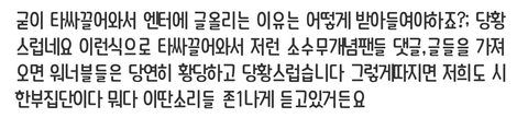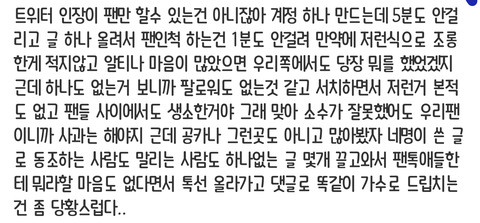그리고 댓글에 계속 사과하라하는데 우리한테 먼저 보여준것도아니고 우린 아무런상황도 몰랐고 엔1터에 올라간거 보고알았는데 그리고보니까 톡1선올라갈때 베댓 그냥전부다 그쪽분들이 잡아먹고 글올려져있더만 우리가뭘 어쩌라는거야