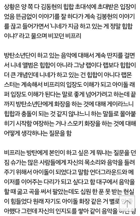 방탄이 뭔 힙합가수들 모이는?그런 자리에 초대받아서 갔는데 거기서 비프리가 면전에 대놓고 니네는 음악이 돈을 벌기위한 수단이냐느니 아이돌들이 화장하는건 게이같다느니 온갖 뭣같은 논리로 방탄 면전에 대고 욕함ㅇㅇ그러다가 도가 지나치기 시작하니까 사람들도 말리기시작하고, 이런저런 얘기하다가 슈가인가 랩몬인가 2차까지 가게된 유명한 오디션이었나 그런 얘기가 나왔는데 알고보니 비프리도 그 오디션에 참가신청을 했던거 ㅇㅇㅋㅋㅋㅋ이렇게 개쪽당하고 집가서 혼자 트위터로 방탄___들 펔킹!이러면서 혼자 분노표출 시전. 이렇게 혼자 열심히 지랄해놓고 방탄노래 가사로 디스 당하니까 인터뷰에서 난 그 사람들을 신경도 쓰지않는다고 했다고함ㅋㅋㅋㅋㅋㅋㅋㅋㅋㅋㅋㅋ게다가 얘 마약전과자고 아무런 연결선없는 아이돌사진 트위터에 올려놓고 게이같지않아요?ㅇㅈㄹ하는 걍 개썅또라이라는데 빌보드열심히 달리고계신 지금의 방탄은 비프리 ㅈㄴ우습겠다. 어휴 뭐 저런애랑 엮여서.....
