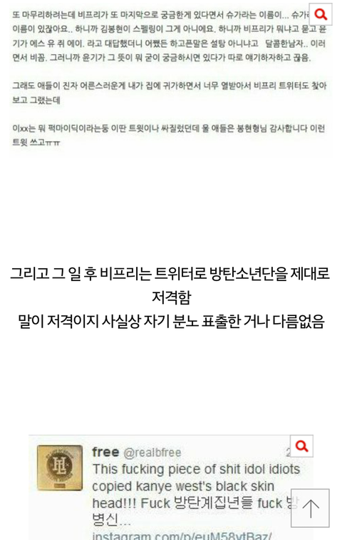 서치하다가 우연히 비프리랑 방탄 사이에 있었던일?같은거 정리해놓은 글같은걸 봤는데 존 나 내가 다 빡치네ㅅㅂ걍 지나가던 사람들 한번씩 읽어보셈 ㅈㄴ아이돌가수팬, 방탄팬 아니더라도 어이가 아리마셍