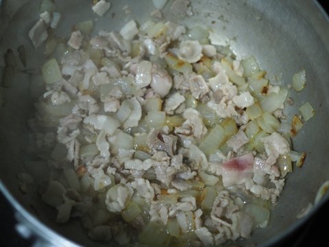 양파가 어느정도 익으면 이제 고기도 넣고 볶아주고 이때 소금 후추로 약간 간을 해줍니다.