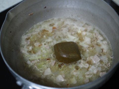 고기도 다 익으면 이제 물을 붓고 고형카레를 하나 넣고 치큰스톡도 하나 넣고 맛을 만들어줍니다.
