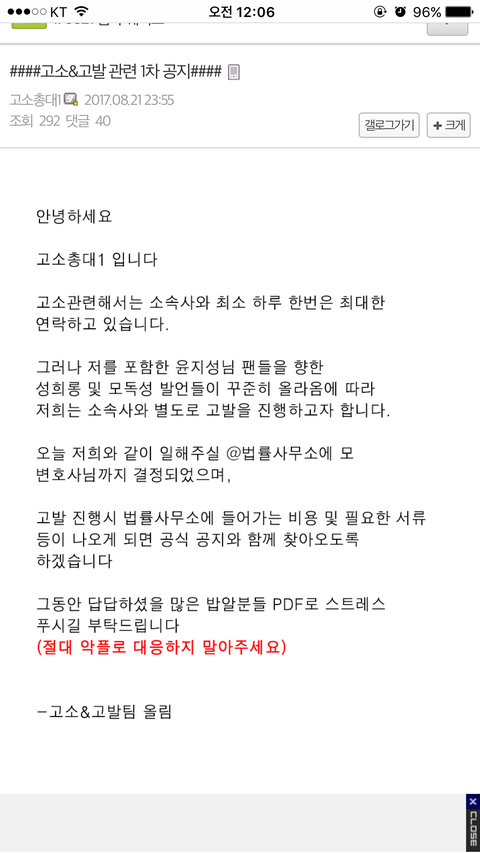 엠엠오 소속사는 별개로 윤지성 마이너 갤러리에서 고소 진행 예정이라고 해. 혹시 판에서 정화하러 가는 워너블들 pdf 따고 있다면 꼭 전달해주길 바랄게.