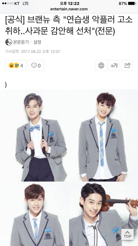 [기사] [공식] 브랜뉴 측 "연습생 악플러 고소 취하..사과문 감안해 선처"