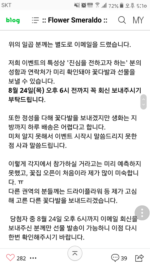 당첨자 7명 중 지방러는 생화배달이 곤란해서 드라이플라워 보내겠다 이랬는데 그럼 스메랄도 블로그 의미가 없지않음?
