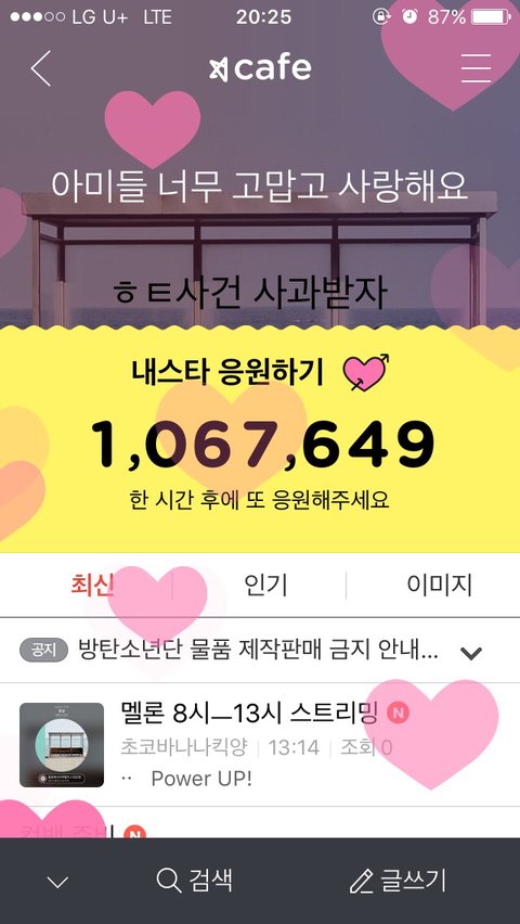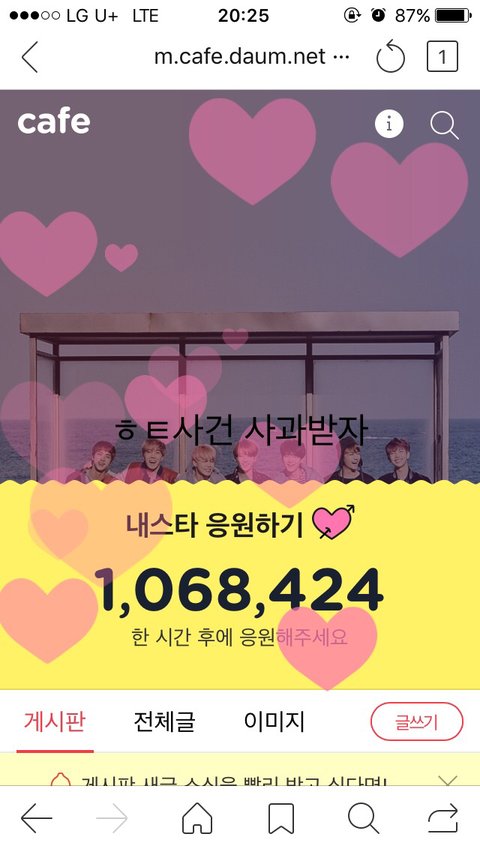 지금 짹에서도 추가 사과 키워드 올리고 #Please_Apologize 해시 올리는 사람들도 줄고 갤에서 입장 정리한글은 타싸로 안옮길거 같고 우리 팬톡은 우리끼리 총공해서 사과 받아야되는거 아님? 이거 해결 못하면 백퍼 컴백하고 또 말나오고 연말에 상이라도 받아봐 온갖 잡소리 다나와. 이번에 이 갈자며. 애들 행복하게 해주자며? 이게 시작이야 첫걸음.