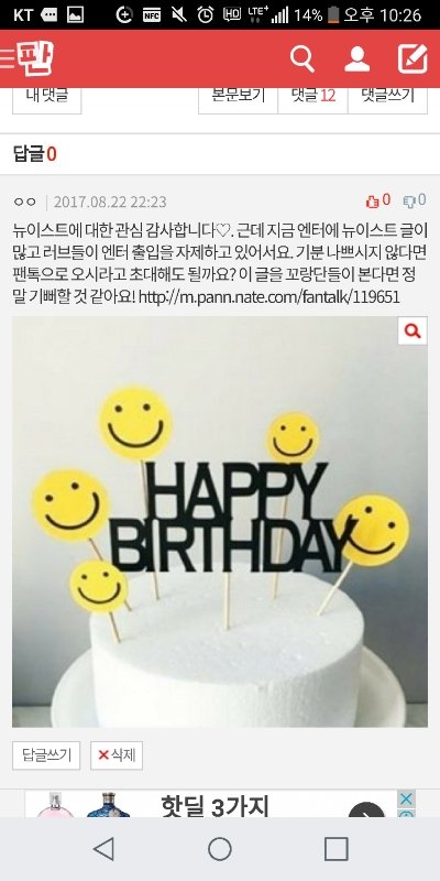 지금 ㅌㅅ 46위에 꼬랑단 생일 글 올라와 있어ㅠㅠ 아까 댓글 달았다고 글 올리고 현생 때문에 잠깐 폰 나뒀는데 완료를 안 눌렀던거ㅠㅠㅠㅠ 댓글 사진 첨부할게... 베댓 만드는게 낫지 않을까..ㅠㅠ뉴잇 애들 얘기도 아니고 꼬랑단 얘기라 ㅇㅌ에 있는건 아닌 것 같아ㅠㅠㅠ
