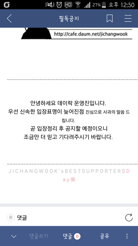 일주일이 넘게 지나고 8/15 자로 올라온 유일한 입장 글은 입장정리 후 공지할 예정이다,