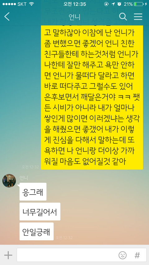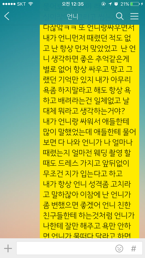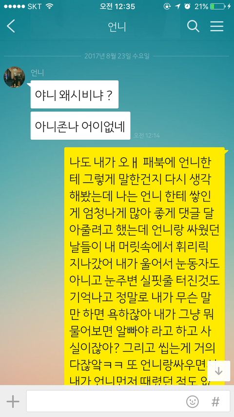 언니가 페북에 자매가 제일 좋은 친구다 라는 글에 나를 태그했는데 내가 언니랑 친해질 마음 없다고 말했단말이야 좀 심하게 말하긴 해서 톡으로 저렇게 보냈어 내가 보낸저말들이 진짜 사실이거든 언니는 진짜 항상 욕하고 나랑 대화를 못이어가 언니가 씹거나 알빠냐고 그러고 나도 언니랑 친해지고싶단말이야 친구처럼 근데 그게 안돼