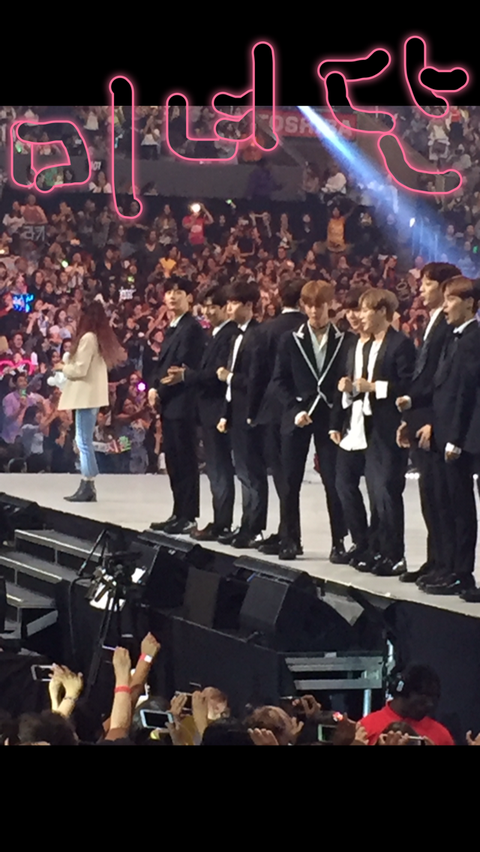 무대 뒤쪽이라 걱정했는데 ㅇㄴㅇ 멤버들이 인사할때 뒤쪽에서서 정말 가까이에서 봤는데 안타깝게도ㅠㅠㅠ미년이가 제일 멀리있어서 무대인사할땐 잘 못봤어ㅠㅠ 다리 엄청길고 아래 스탠딩 팬들한테 계속 인사해줬어