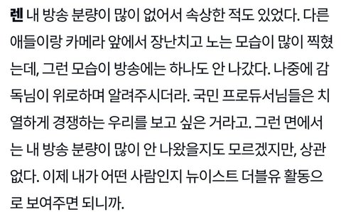 사람마다 그래 다를 순 있겠지. 근데 적어도 난 애들의 이런 모습을 더 보고싶었다.. 마냥 웃고 즐거워 하는 애들 모습, 팀원들간의 협동으로 멋진 무대 만들기 이런거 원했음..