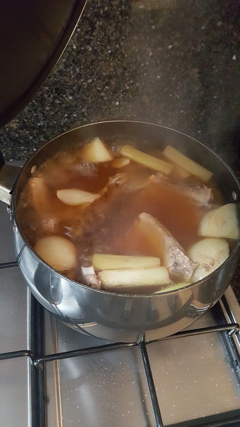 불을 약불로 줄인 후 폭립을 넣고 은은하게 삶아줍니다.