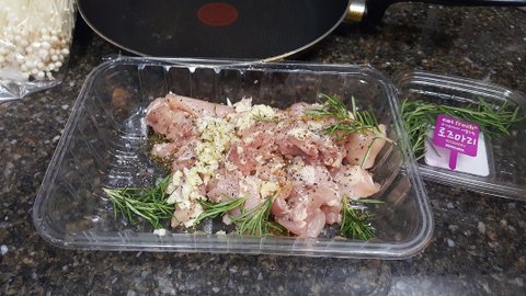 한입 크기로 썰은 후 올리브오일 마늘 소금 후추 로즈마리를 넣고 주물러주세요.