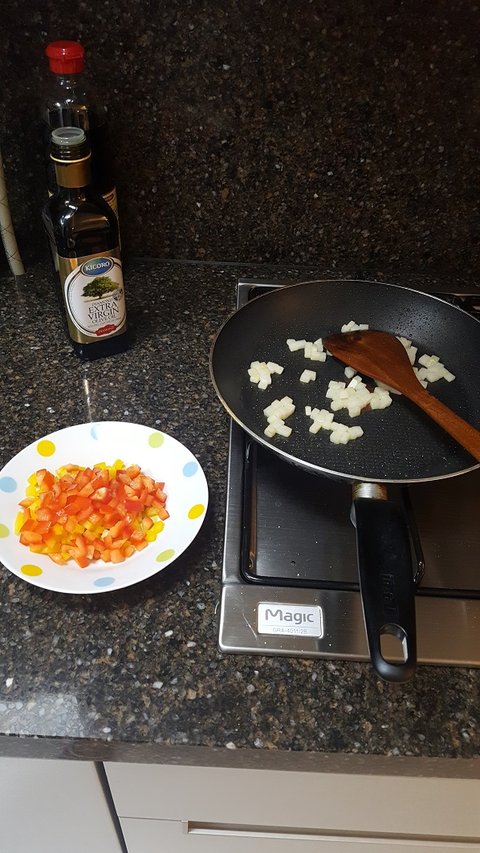 아무튼 양파와 파프리카를 잘게 썬 후 팬에 살짝 볶은 후