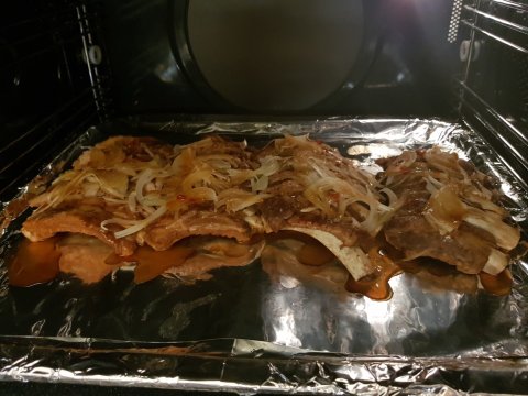 폭립 위에 양파를 얇게 썰어서 잘 덮어주고 폭립을 삶았던 육수를 졸여서 위에 골고루 뿌려주세요.
