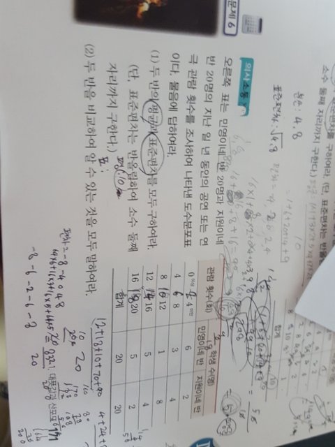 6번문제 표준편차 구하는걸 모르겠어..민영씨네 반 표준편차가 자꾸 4어쩌구 몇 나오는데 답은 6.45래..누가좀 알려줘ㅠㅜ