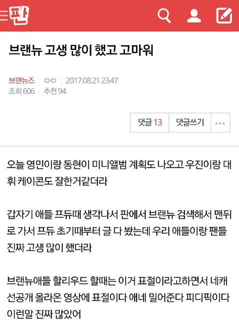 "정말 브랜뉴 애들 좋아하길 잘했다" 라는 생각이 들었고 진짜 뿌듯해 브랜뉴애들이 우리 팬들끼리 이렇게 사이가 좋은걸 알면은 얼마나 좋아할까ㅎ