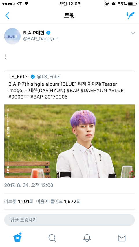 올라오고 몇초뒤에 댛니가 올렸네ㅜㅜㅜ기다리고있었나봫ㅎㅎ 진짜 머리색 너무 잘어울림ㅠㅠㅠㅠㅠㅠ 역시 존잘ㄹㅠㅜㅜ