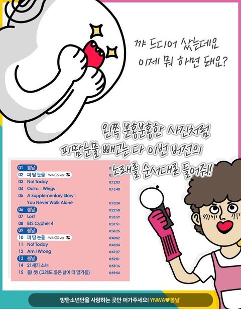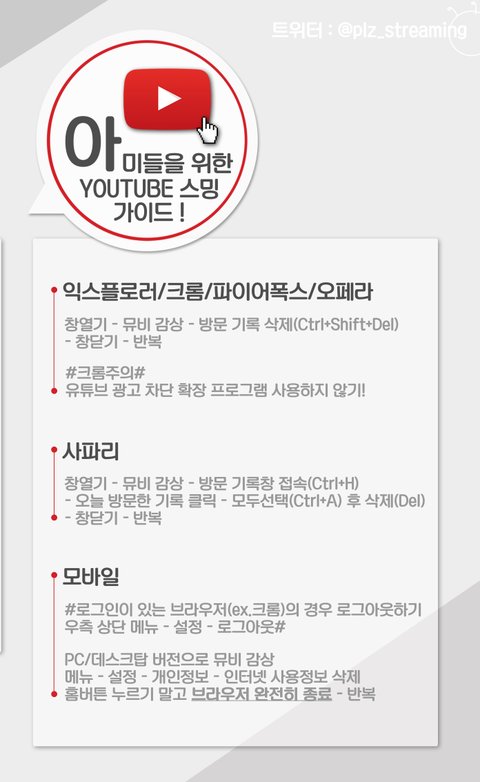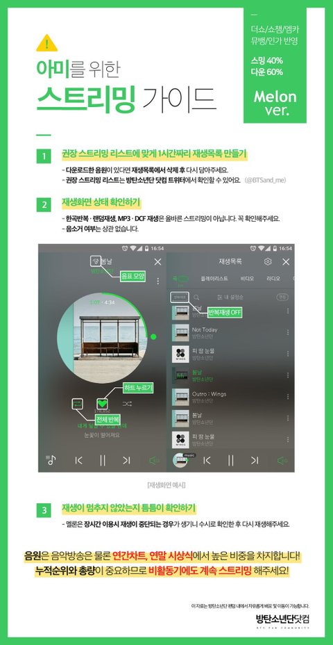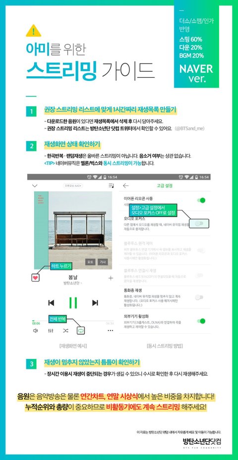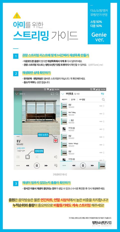 5) 뮤비 스트리밍 가이드https://goo.gl/oir7v3  <<클릭 후 '북마크'플래이 리스트 선택 2시간 후 캐시 삭제 (참고: https://goo.gl/42g2qp)-> 반복 리스트 재생 (모든 재생목록은 2시간 이내-오차 범위 5분-로 구상)주의사항 : [로그아웃 상태]로 뮤비 스트리밍, 화질은 반드시 720p 이상, 음소거 금지, 중간에 포함 된 짧은 방탄밤 영상은 [누락]을 최소화 하기위함으로 임의로 건너뛰거나 하지 않기