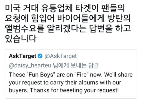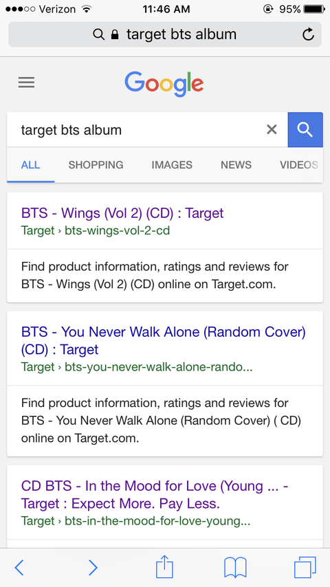 이삐드으으으ㅡ르으으으으으르ㅡ르르를!!! 내가 어제 짹짹이에서 저 글을 보고 엄청 놀랬었거든?? 우리 집 앞에도 타*겟 있고 이 지역에 널린게 타*겟이라 저 소식을 듣고 얼마나 안 믿겨졌는지 몰라 ㅠ그래서 오늘 호기심에 goo글에 타*겟 방탄소년단 앨범이라고 치니깐 저렇게 나오는거야. 순간 당황해서 내가 보고 있는게 실화일까? 싶을정도로 믿겨지지가 않았어 ㅋㅋㅋ 근데 아직 앨범 준비중이긴한데 차차 준비될 예정인가봐. 어제 소식 들었을때는 설마설마했는데 진짜 준비중일줄이야ㅠ 이제 우리 집앞에서도 애들 앨범을 살수가 있다니 진짜 감격스럽다 흑ㅜㅜ 우리 애들이 이렇게 성장했구나 싶어서 너무 기쁘고 눈물난다. 그냥 이 좋은 소식을 이삐들한테 빨리 알려주고 싶어서 왔어!