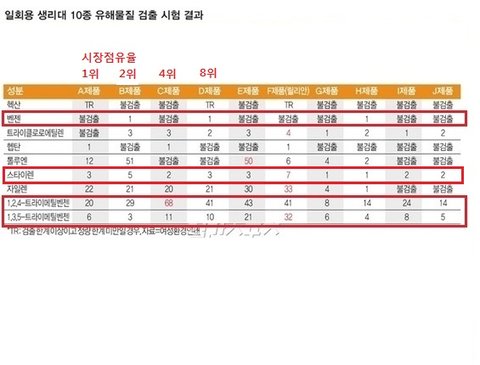 발암물질 : 벤젠, 스타이렌*벤젠 검출: B제품(시장점유율2위제품) ,D제품, H제품*스타이렌 검출 : 전품목에서 검출('릴리안 파우더향 팬티라이너'가 가장 높게 검출됨) *트라이메틸벤젠 검출 : 전품목에서 검출 (가장 많이 검출된 제품이 시장점유율 4위 제품, 두번째로는 릴리안 제품의 팬티라이너)(트라이메틸벤젠은 발암물질은 아니고 유럽연합에서 피부 자극을 일으키는 물질로 분류했지만 국내서는 특별한 기준이 없는 상태다.)스타이렌이라는 발암물질은 전품목에서 나왔는데 왜 릴리안만 공개하는지 . 릴리안은 게다가 생리대가 아니고 팬티 라이너.