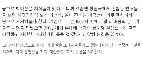 ㅇㅇ 우결할때건 어디서건 자주 본 박미선이 연예인중에 칭찬하는 사람이 에릭남, 유재석 뿐이라고ㅋㅋㅋ 심지어 에릭남은 박미선님 딸이랑 결혼시키고 싶어할 정도라 농담으로 소개시켜준다고 했다함ㅋㅋㅌㅌㅋㅋㅋ 진짜 연예인이 자기 여동생이나 딸 결혼시키고 싶어하는 남자연옌은 진국이란뜻임 웬만큼 괜찮지 않으면...ㅋㅋ