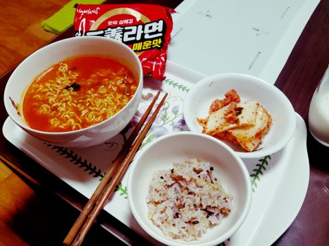 삼양라면 매운맛 새로 나와서 사먹어봤어요. 원래버전도 국물이 찐해서 삼양만 먹었었는데.. 요건 깔끔한 매운맛이라 완전 맛있네요.