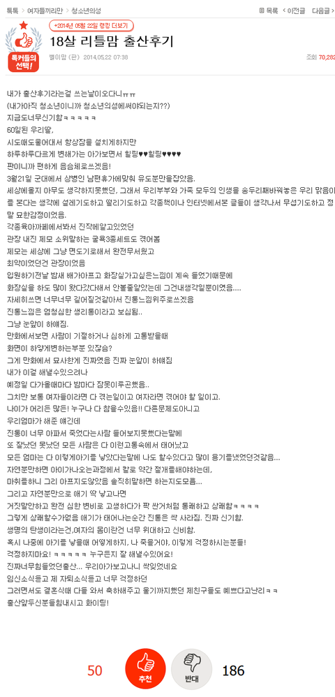 음 10대에 애낳은것이 칭찬받을 일은 절대 아니고 생명이 탄생한건 정말 축하할일임 근데 솔직히 까놓고 말해서 동창생들 사이에서 ㄱㄹ로 기억되는건 사실임 그니까 10대 때 성관계좀 하지말자좀 그리고 한창 수능 1년 남기고 피터지게 공부하고 경쟁할 나이에 ㅅㅅ하고 출산앞두신 분들께 화이팅이라니... 애낳은건 정말 대단한 일이긴 해도 만약 내 자식이 저러면 꼭지 돌아버릴듯
