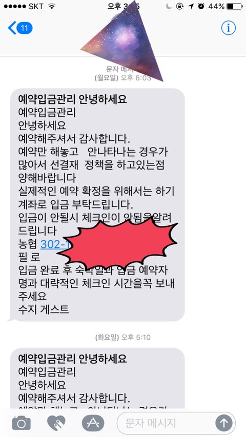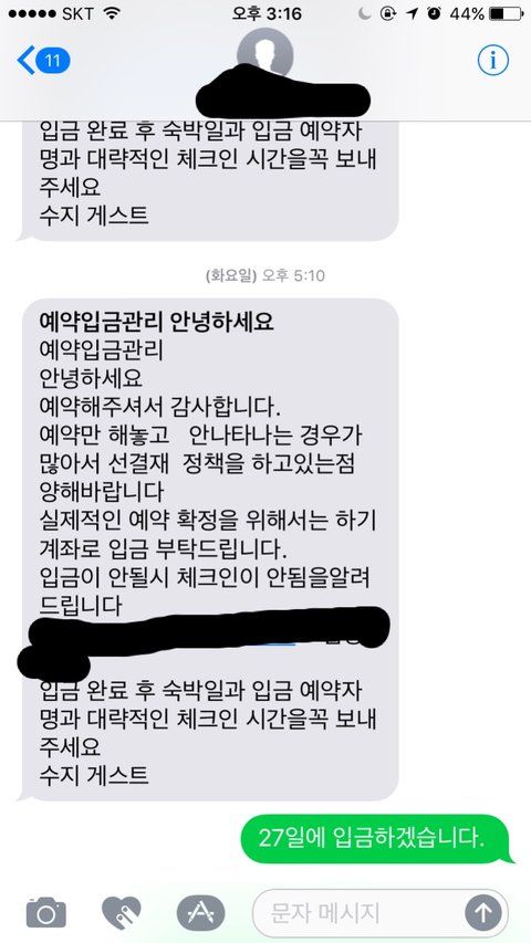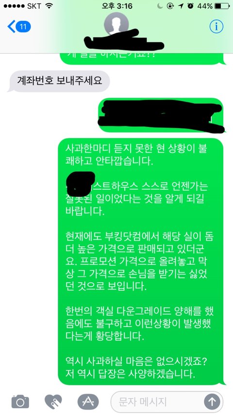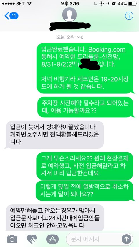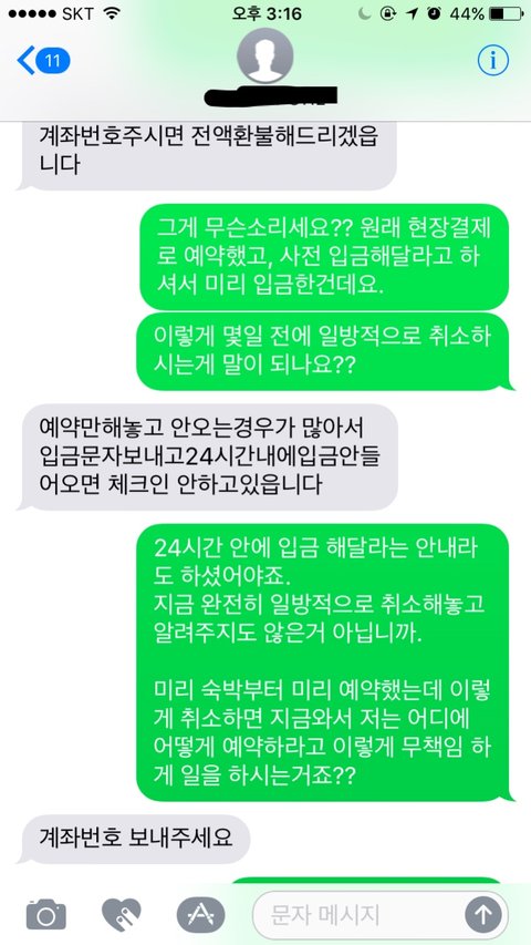 어이가 없어섴ㅋㅋㅋㅋ 일방적으로 이러는 것도 문제고, 이미 취소가 됐다면 취소 시점에 알려줘야지 입금할때까지 한 마디도 없었던게 말이 되냐고 했더니 24시간 이내에 입금 안하면 취소된대요. 그런말은 문자 어디에도 없었어요. 사과한마디 없이 "환불계좌 알려주세요" 라는 답장만 오더라구요.