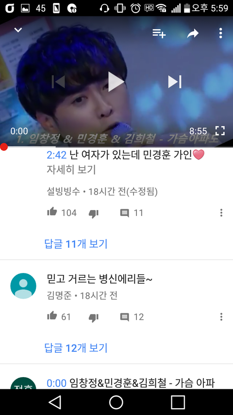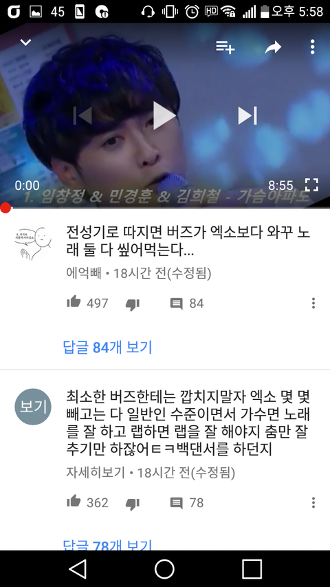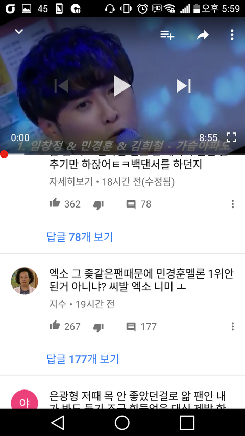 보임? 저 영상은 아는형님에서 나온 가수들 노래 모음임.그런데 저기에 백현이 김희철 민경훈이 같이 부른 나비잠과 첸의 티얼스가 나옴. 단지 그 이유만으로 저렇게 까임.심지어 엑소엘들이 참여했는지 안했는지 증거도 없는 버즈 별점테러를 에리탓이라고 몰아감 그래서 멜론 버즈 순위가 낮은거라고(미리 말하지만 별점은 순위랑 별 상관 없음)심지어 저 3개의 댓글 외에도 댓글의 과반수가 저런댓글임 못믿겠으면 직접 영상 보셈 아는형님 가수들 노래모음이라 치면 나올거임