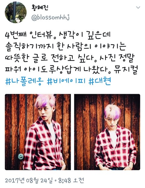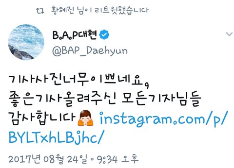 대현이 트윗 보고 기자님 기분 좋으셨겠다ㅎㅎ 예의도 바르지ㅠ 기자님한테 칭찬 들으니 자랑스럽고 멋지고 그렇네 우리 대현이