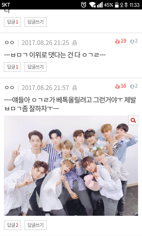 이댓들 추천좀 눌러주라 댓좀 정화하게 그리고 글좀 신고해줘 스밍인증없는 어그로글 ㅂㅁㄱ 해주고 진영이 최애들 상처 받았지.... 나도 내가 할 수 있는 최대한의 ㅂㅁㄱ을 했어.. 상처받지 말구 어덕행덕해