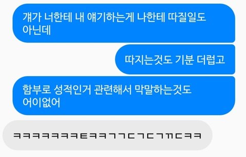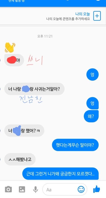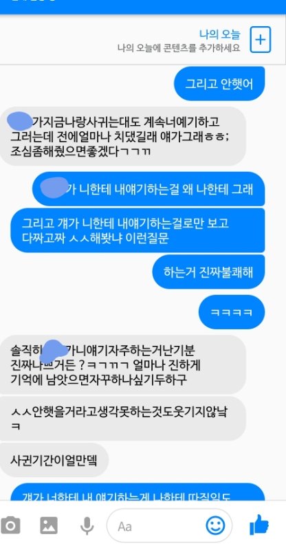 내 전남친이 새로운여친이 생겻는데 걔가 좀 소위말하는 잘나가는(?) 무리에 잇고 좀 기도 쎄서 애들이 만만하게 못본단말이야 근데 갑자기 저렇게 왔는데 순간 화나서 말저렇게 했는데 그래서 그런지 페북엔 내저격글 올라오고 나 어떡해 지금 너무 무섭다 월요일에 학교가서 뭔일 생길까봐.. 뭐라고 답장해야하지? 조언좀 부탁해 판녀들아 제발 속도 화나고 손도 떨려ㅜㅜ 댓글 부탁해...ㅠㅠ