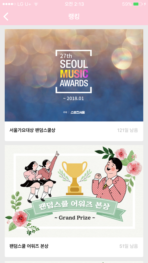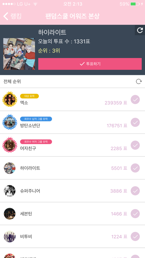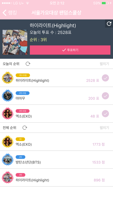 팬덤스쿨 깔아서 서가대 투표해조!! 오늘 순위는 1위인데 누적순위는 3위야 조금만 열심히해서 더 올라가자 할수있어 연말에 울오빠들 상안겨주자❤️