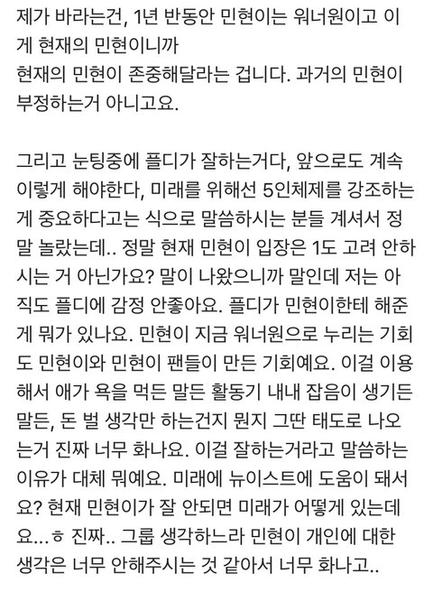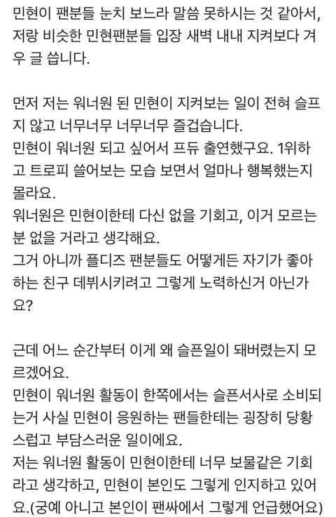 어제 정말 잠도 제대로 못자고 민현이 양쪽에서 머리채 잡히고 욕먹는거보고 플디가 정말 민현이 위해서 하는 행동인지 모르겠어