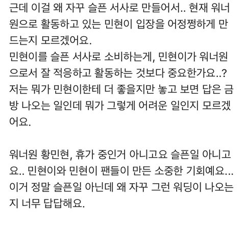 황민현팬인데 구구절절 맞는소리임. 황민현이 속한 그룹이라면 워너원이든 뉴이스트든 다 응원해. 근데 뭐 악개니 뭐니 몰아가지 말았으면 좋겠음..