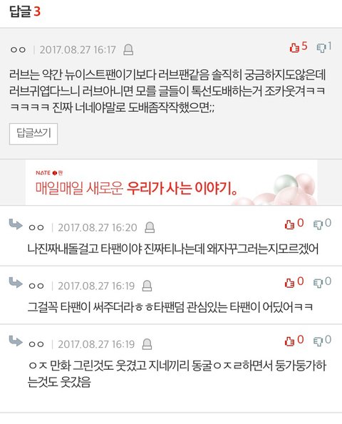 글쓰면 언될것 같아 원래 글쓰는거 댓글쓰는거 다 금지였지만 한번더 강하게 잡아야할것 같고 안좋게 보는사람들 너무 많은것 같아... 러브들 의견은 어때? 이제정말 우리끼리 동굴에서 놀자ㅠ 그래도 우린 정말 정화하려고 최선을 다한것 같은데 저렇게 말하면 진짜 우린 뭐가되는거지..