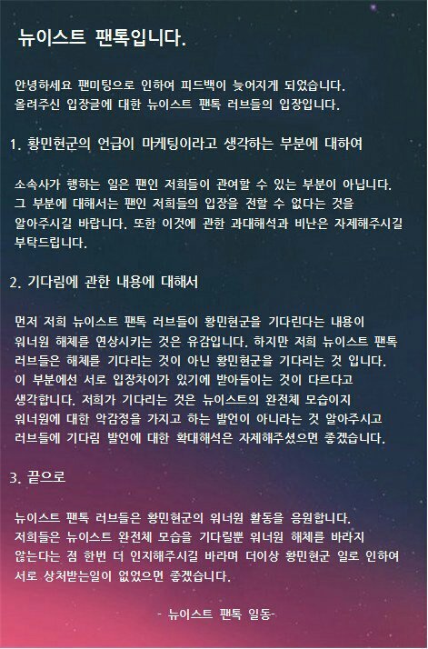 워너원은 황민현 군을 비롯한 11명 멤버의 소중한 시간입니다. 이를 이별과 헤어짐과 같은 단어들로 치부하는것은, 워너원을 응원하는 집단에게 큰 상처가 될 수 있음을 알아주셨으면 좋겠습니다.