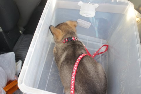 리빙박스에 넣어 , 뒷자석에 태웠더니 낑낑대서 조수석 바닥에 얌전하게 엎드려 왔다고 해요 ^_^