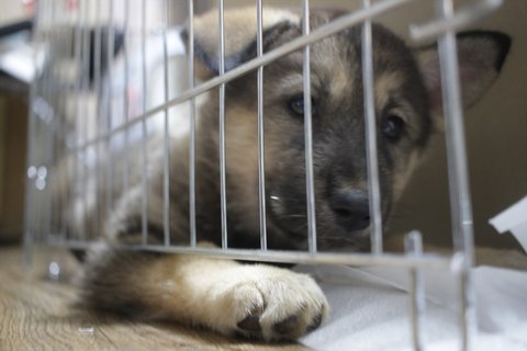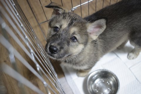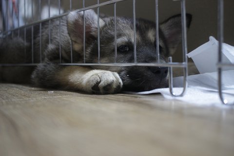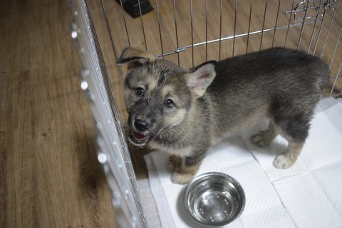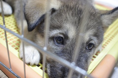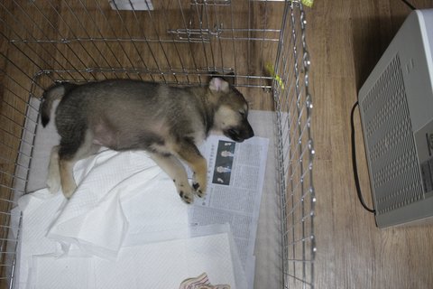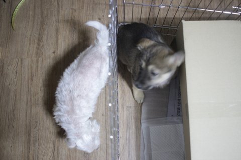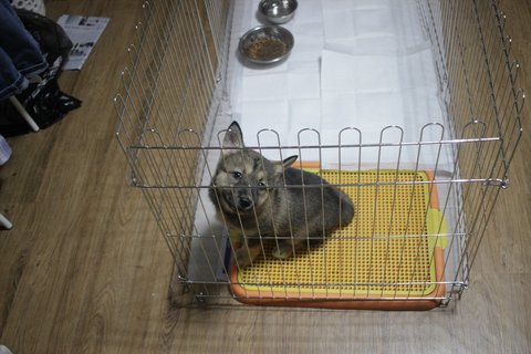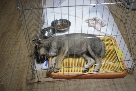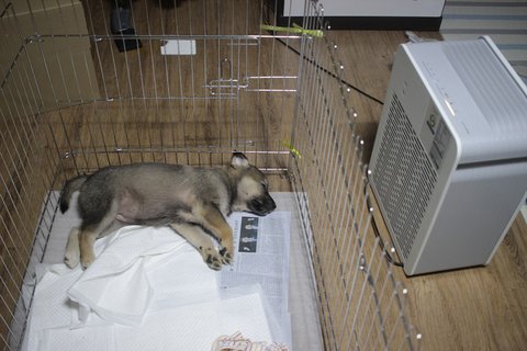 그래서 케이지에 넣어뒀어요 ^^ 어미개와 다른강아지들과 두달남짓 생활하다보니 아무래도 냄새가 ^^