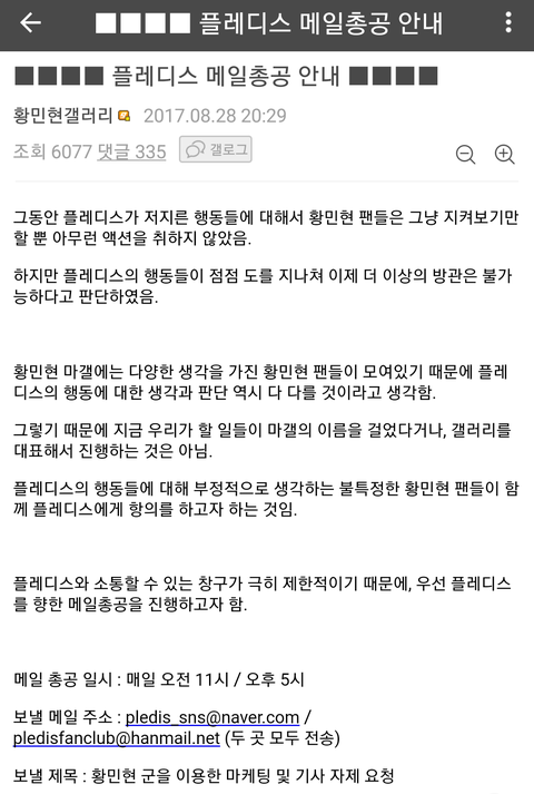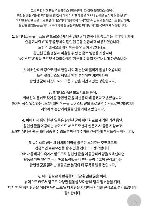 혹시 오해하실 분들이 계실까봐 글 남깁니다 현재 게시된 내용은 황민현마갤 일부의 단독 행동이니 전체 황민현팬들의 생각이 아님을 밝힙니다 또한 현재 ㅇㅌㅌ에 황민현군의 이야기가 자꾸 회자되는 것을 불편해 하시는 타팬분들이 많으신걸로 압니다 그러니 더이상의 분란을 잠재우기 위해 협조 부탁드립니다 더이상의 파생글 댓글은 자제해주세요 [황민현팬톡은 ㅇㅌ 출입을 삼가고 있습니다 글 내려 주세요]
