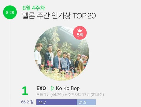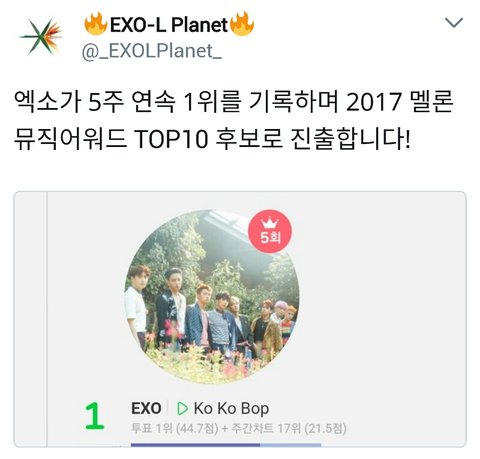 엑소가 5주 연속 1위를 기록하며..ㅊㅊ