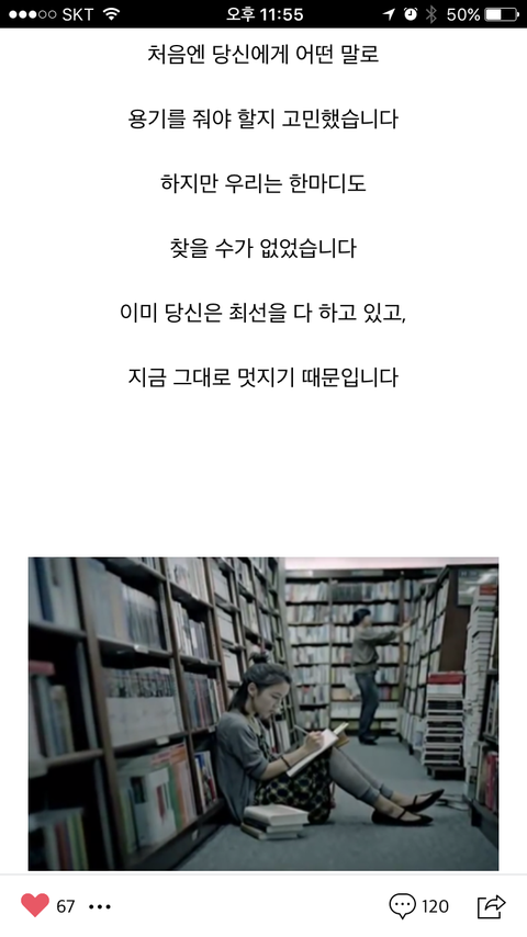 위로(?)가 될지 모르겟지만 내가 좋아하는 광고 중에 힘이되는 문구 좀 가져왓어. 평소에 나는 저 글들 곱씹는편이거든...다들 조금이라도 위로되고 기운 차렷음 좋겟다
