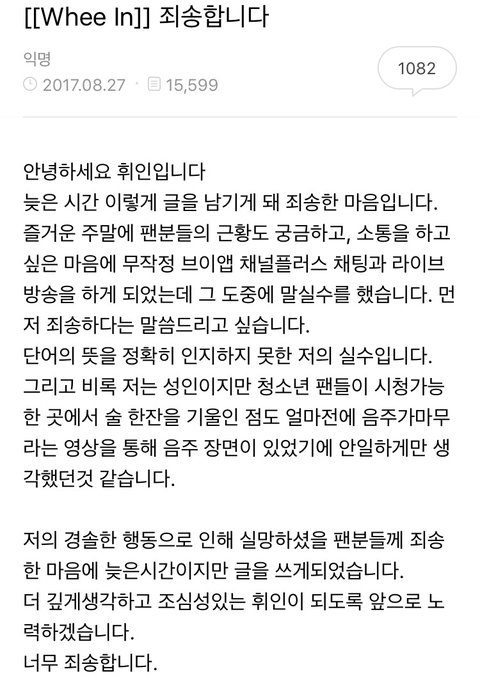 총 2번의 방송 중 휘인양은 소주인 청하 2~3잔을 기울였으며 비속어는 일제 사용하지 않았습니다. 모든 방송이 끝난 후 27일 새벽 마마무 공식 카페에 잘못된 언어 선택과 음주 방송에 대한 사과의 글을 올렸습니다.