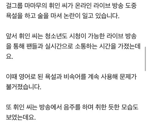 안녕하세요. 마마무 휘인양에 대한 기사를 보며 많은 것이 왜곡되어 대중들에게 전달되고 있다는 생각이 들었고 어디다 하소연 할 곳을 찾다가 여기에 글을 쓰게 되었습니다.