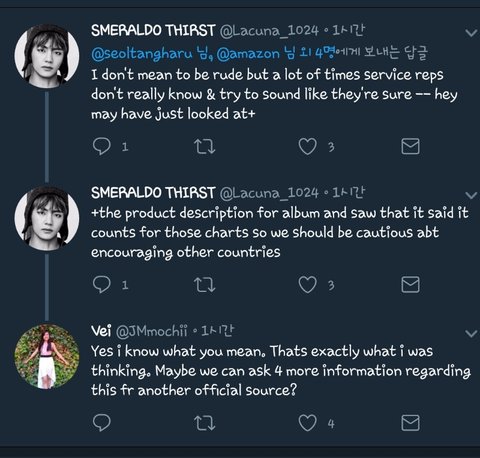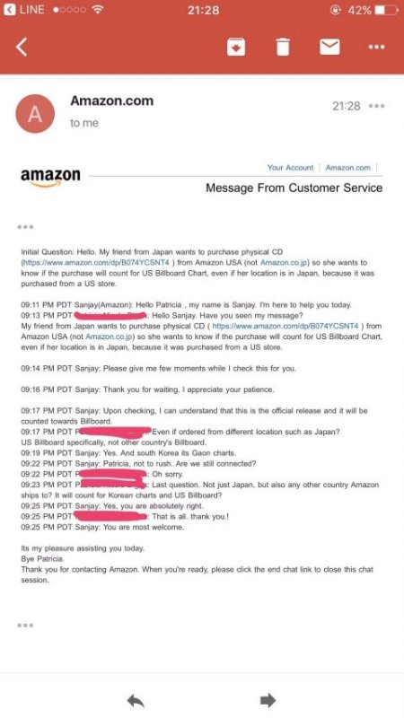 이삐들ㅜㅜ 이 짹 보고 한국에서 사도 빌1보드 반영이 된다고 하는데 솔직히 아마존 고객 지원 센터에서 일하는 사람들이 이 문제에 대해 확실하게 알 수 있는 방법이 없어.. 여기서 "확인" 한게 빌보드한테 직접 문의한게 아니라 그냥 대충 앨범 descr1ption보고 반영된다고 한거일수도 있고 많은 외랑둥이들도 저 트윗 보고 의아해 하더라..